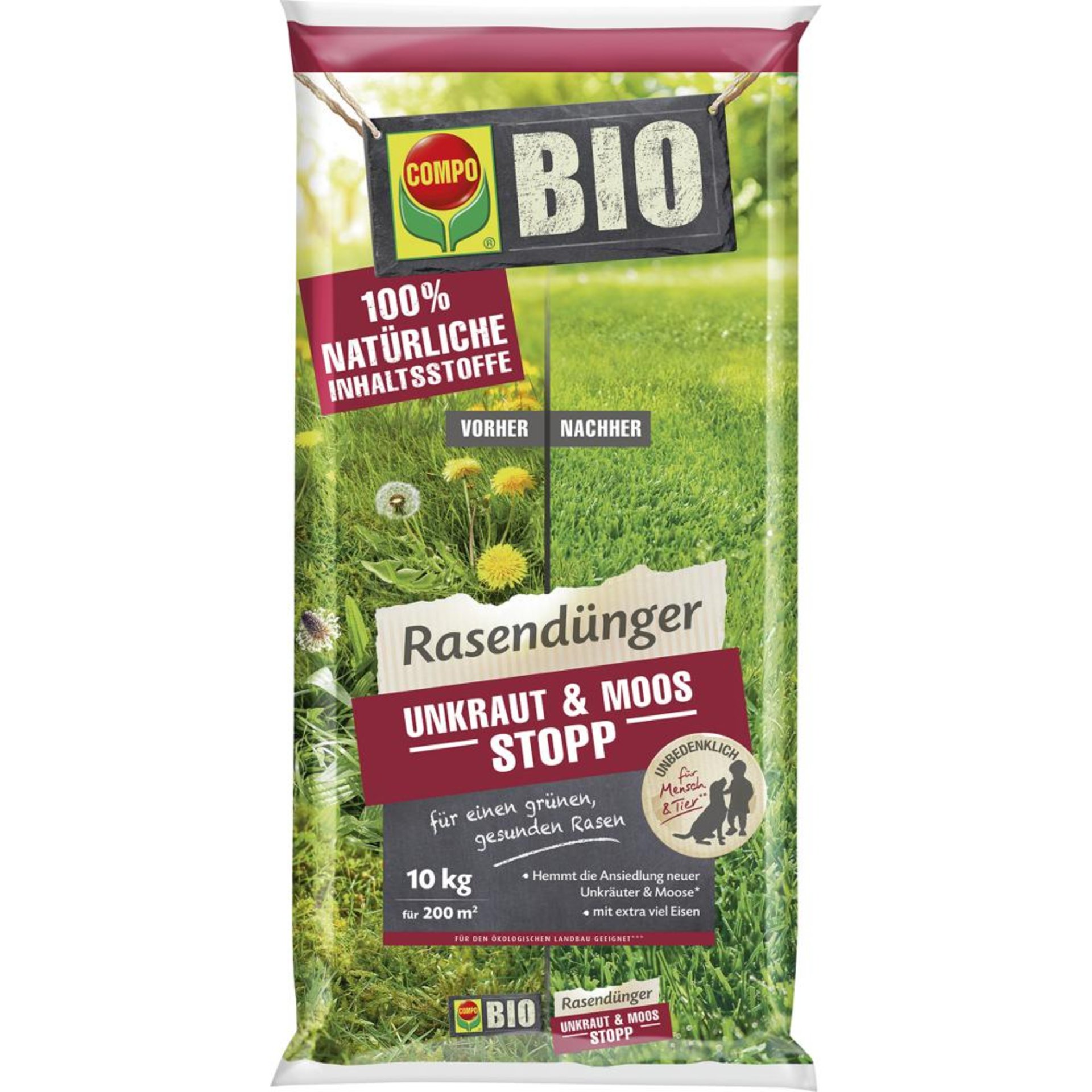 Mit dem organisch-mineralischen COMPO BIO Rasendünger Unkraut & Moos Stopp können Sie Ihrem Rasen etwas Gutes tun und ihn zugleich vor Unkräutern und Moos schützen. Das Spezial-Produkt ist optimal auf die Bedürfnisse des Rasens abgestimmt. Durch die regelmäßige Anwendung des Rasendüngers fügen Sie Ihrem Rasen wichtige Nährstoffe zu, die er für ein dichtes und gesundes Wachstum benötigt. Zugleich entzieht der COMPO BIO Rasendünger Unkraut & Moos Stopp den Unkrautsamen im Rasen die Wachstumsgrundlage und wirkt somit vorbeugend gegen unerwünschten Unkrautwuchs.